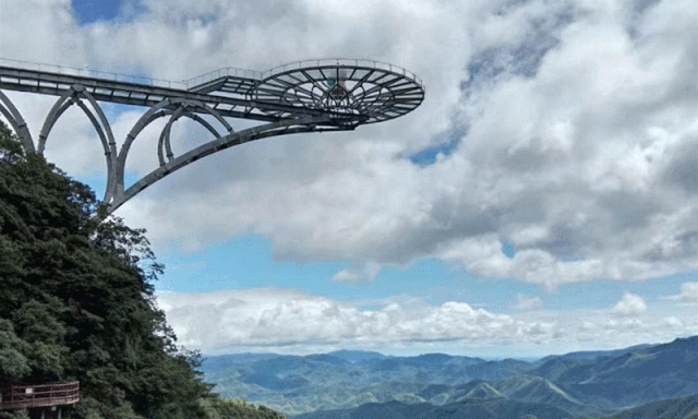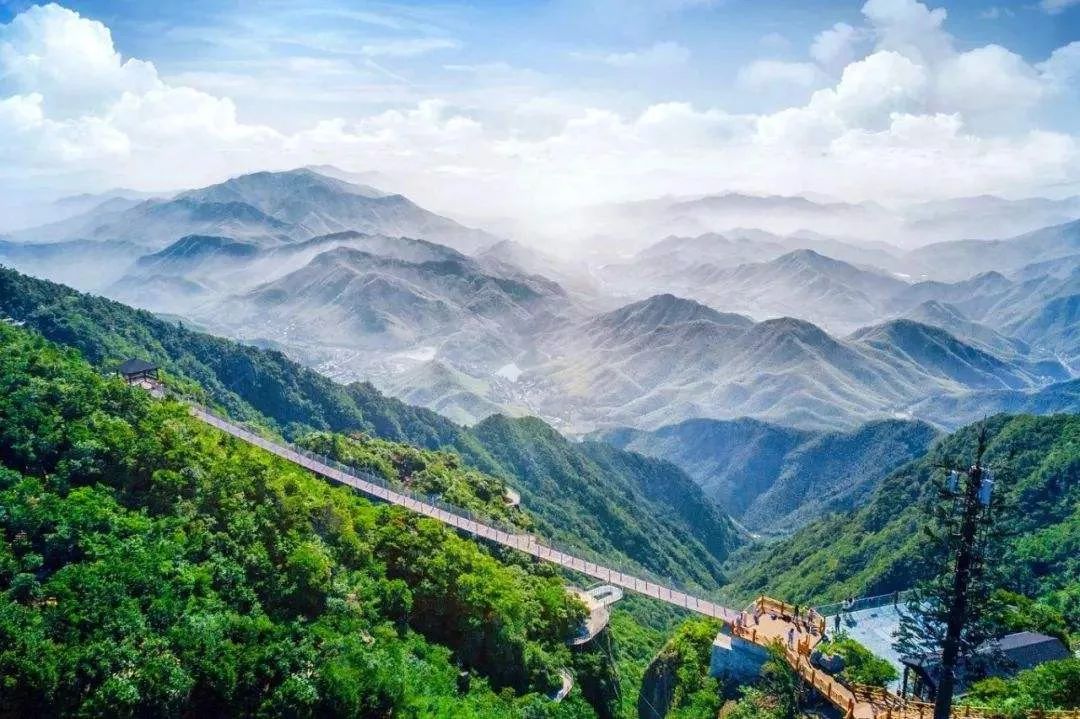 云海栈桥,翻山越岭,只为了看云卷云舒,131米长的木板栈桥上,一定能感受“我要飞得更高”这样的畅快,而且总能拍到远山与云海。西边是餐饮服务中心,远处是彩虹滑道,东边是千米悬崖和群山峻岭、无限旖旎风光。