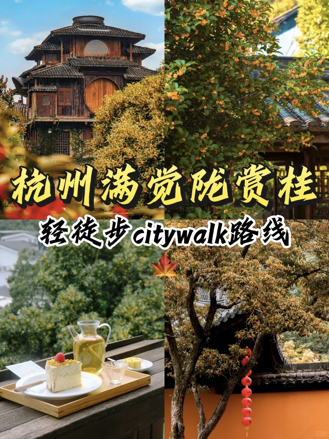 09:00 九溪公交站大石头处集合签到🙋‍♀️,迟到不等。领队会讲解路线概况和注意事项,简单热个身出发寻桂啦!11:00沿着山间小道,远离城市的喧嚣,一路经过九溪烟树、杨梅岭等13:00左右继续出发,寻着清新的桂花香味到达满觉陇午餐。金秋十月正值满觉陇桂花盛开,香满空山。第一站石屋洞洞洞相连的一座小公园,院子里种了好几棵古桂花树,走走逛逛很舒服!第二站山之觉醒这家咖啡厅门口的蓝色复古轿车拍照很出片,第三站满陇桂雨,沿着小路向上走就是满陇桂雨,第四站 沿着小路向上走步行3分钟就能看到网红木屋“汤屋”千与千寻的既视感。第五站 网红秋千,茶山向上走爬山 15分钟左右就能登顶荡着秋千,俯瞰西湖和大片茶山,景色非常好。第六站 上满觉陇从网红秋千下来顺着小路往上,满街的桂花香沿路是各种小吃摊,咖啡厅,还有一颗茂盛的柿子树~!16:00 到达玉皇山八卦田,继续前进到水澄桥地铁站解散,群里分享一路的赏桂美景美图美食😘期待下次再见