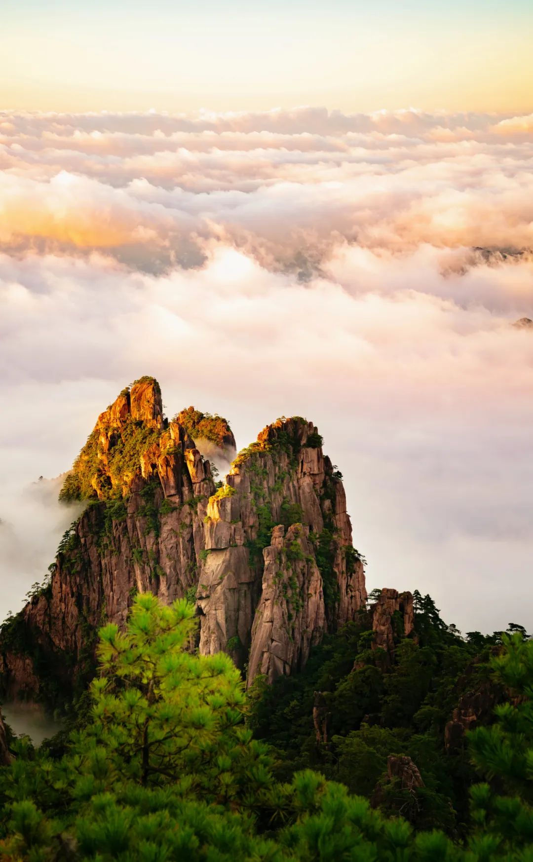 除日出、日落、云海、奇松、怪石外,不可不提八十二座山峰,或崔嵬雄浑,或峻峭秀丽,天然巧成,尤以天都峰、莲花峰、光明顶三大主峰最惹人神往。